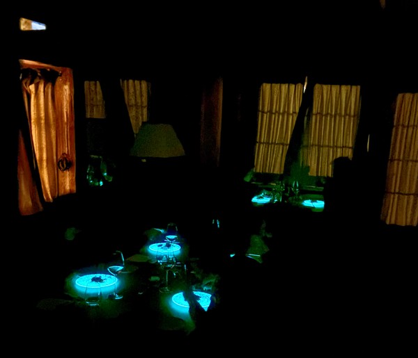 Repas servi au restaurant dans une semi obscurité Assiettes et bougeoirs luminescents